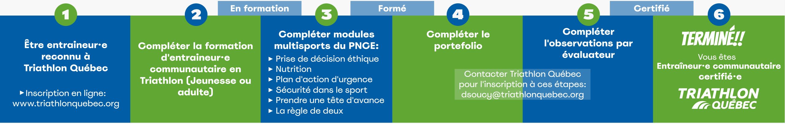 Le développement des entraîneur·e·s de triathlon est soutenu par l’Association canadienne des entraineurs (ACE) et la formation propre au sport du Programme Nationale de Certification des Entraineurs (PNCE).